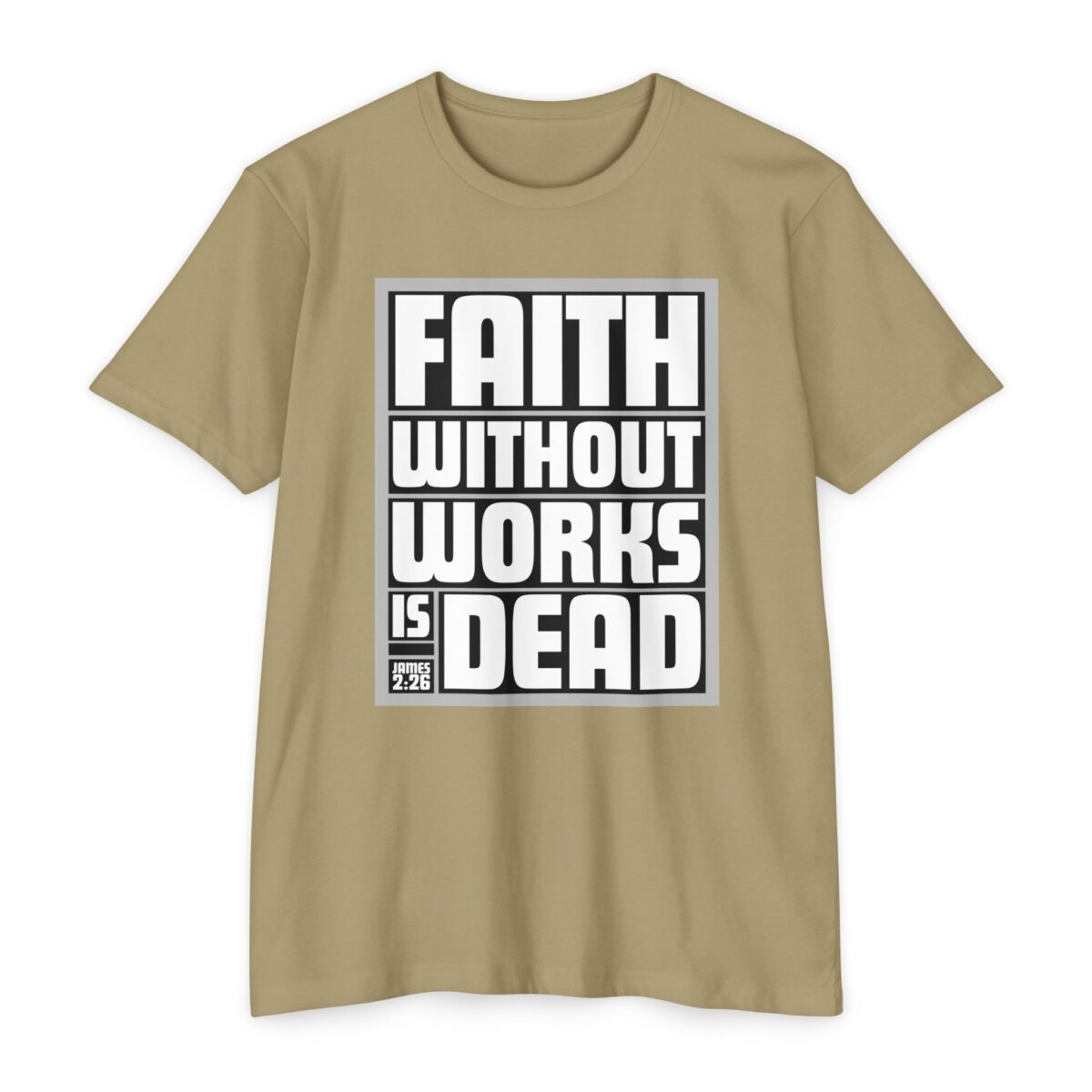 • Bold “Faith Without Works Is Dead” design